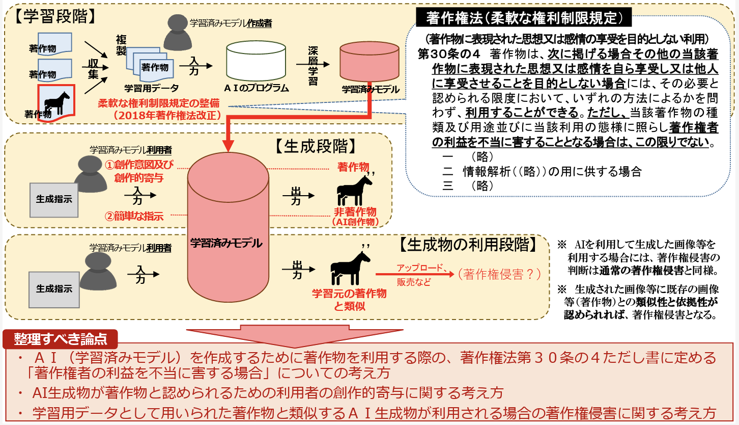 こちらは文化庁が公表している、AIと著作権に関する考え方をまとめた公式資料です。合わせてご覧ください。 https://www.bunka.go.jp/seisaku/bunkashingikai/chosakuken/pdf/94037901_01.pdf