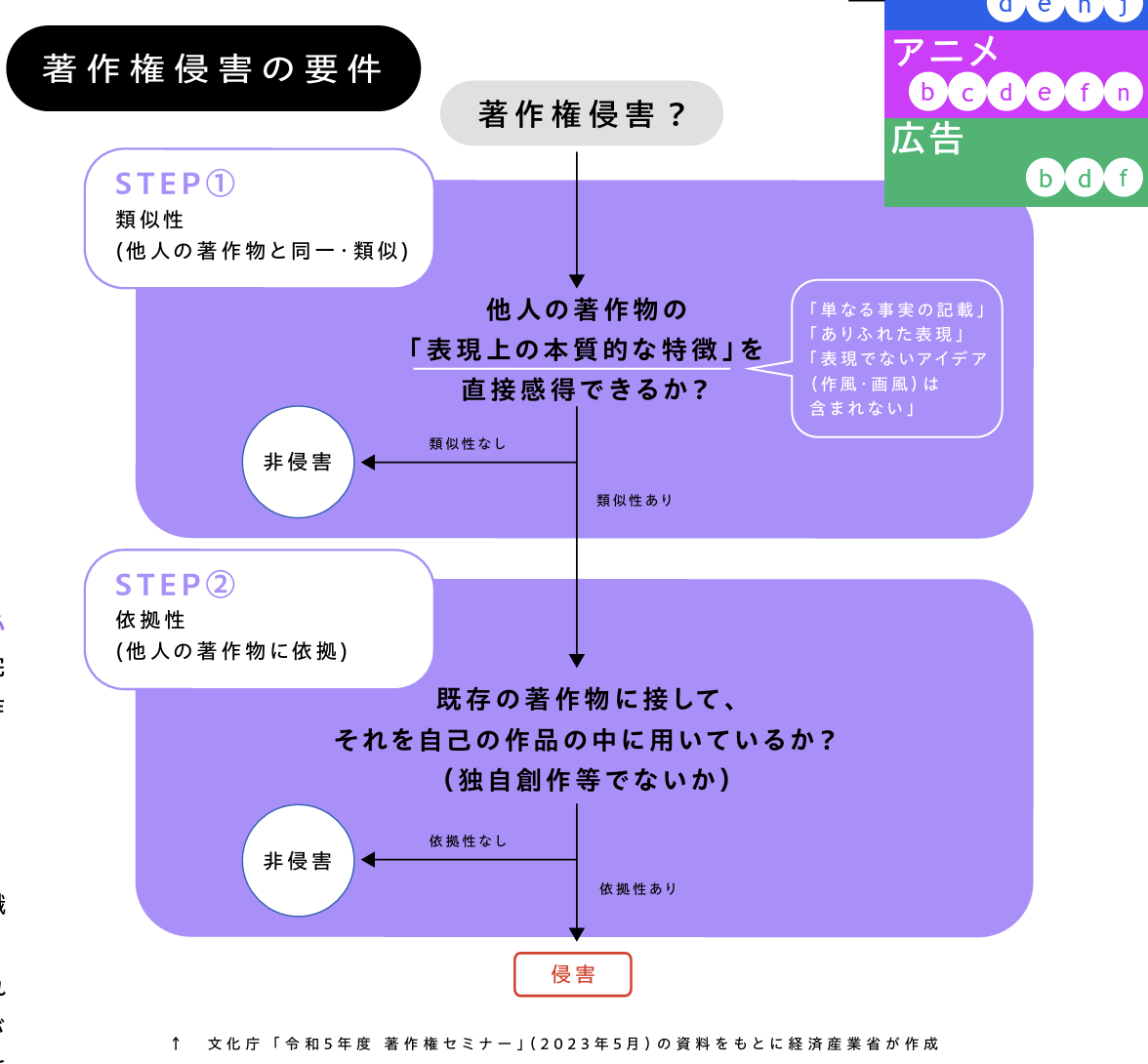 こちらは文化庁のセミナーで使われた、生成AIと著作権の関係を解説した資料です。図解も多く分かりやすいので、合わせてご覧ください。 https://www.bunka.go.jp/seisaku/chosakuken/pdf/93903601_01.pdf