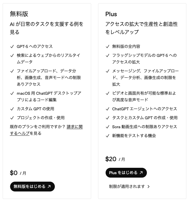 月額20ドルで最新モデルGPT-5やデータ分析、Webブラウジングなどの全機能を利用でき、コストパフォーマンスは非常に高いです。日常的にChatGPTを活用し、その能力をフルに引き出したい方に最適な選択肢です。