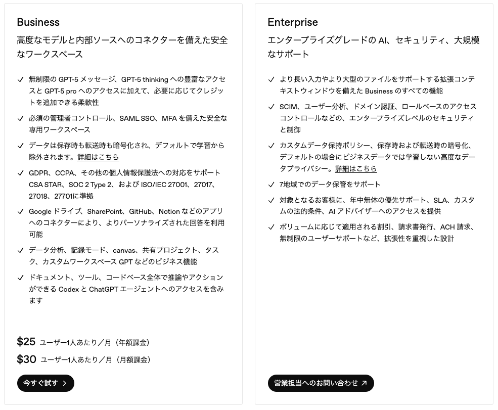 最高レベルのセキュリティ、プライバシー、管理機能を求める大企業向けの最上位プランです。Teamプランの全機能に加え、SAMLシングルサインオン(SSO)による高度なアクセス管理、無制限のGPT-5利用、専任のアカウントサポートなどが提供されます。組織全体でChatGPTを安全かつ大規模に導入したい場合に最適なプランです。