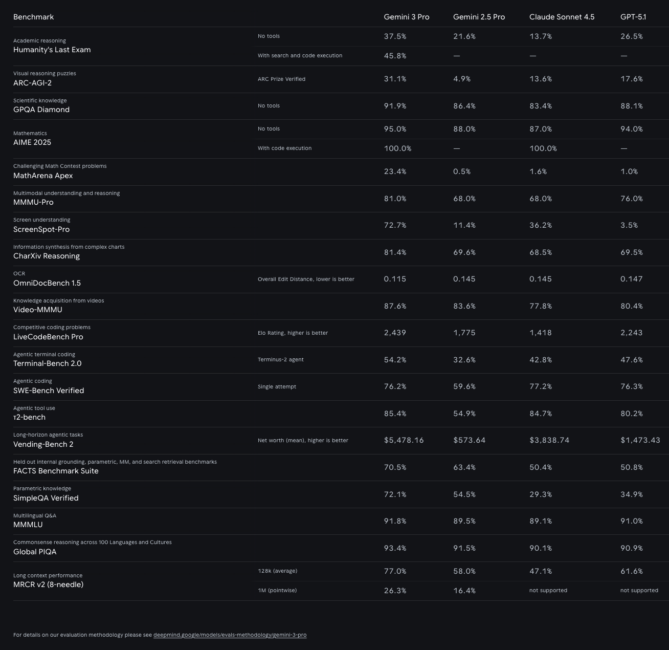 Googleは、Gemini 3 Proが「主要ベンチマークのすべてでGemini 2.5 Proを上回った」と発表しており、競合他社の最新モデルに対して圧倒的に優れているという結果になりました。