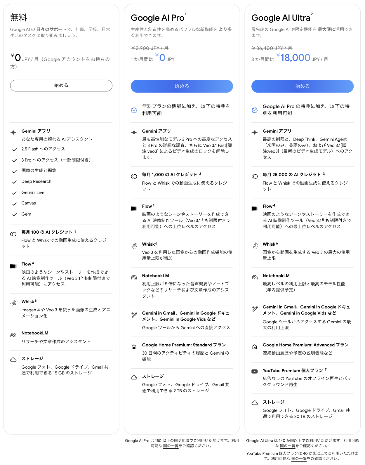注意: 学生向けには「Google AI Ultra」が2026年まで無料になるキャンペーンも実施中です。