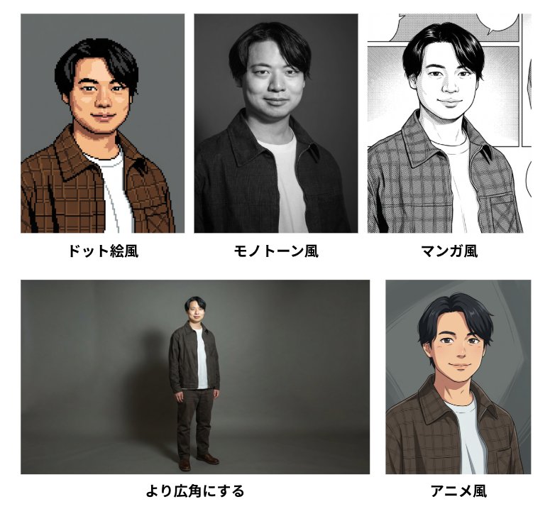 添付の画像をが画像編集ツールを用いて「{変更したいテイスト} 」に変更して欲しい。を入力してできた画像の一覧。自由に画像を変更することが可能である。ー引用:Taskhub