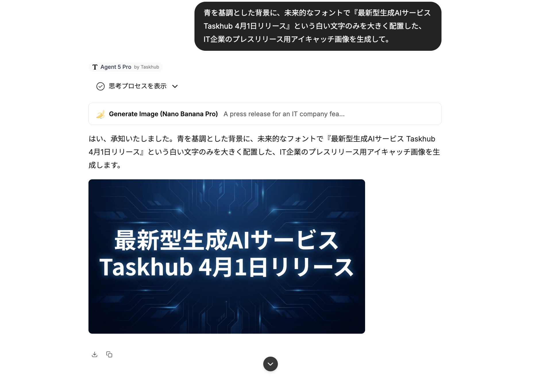 特筆すべきは、その精度とプロンプトへの忠実性です。例えば、「青を基調とした背景に、未来的なフォントで『最新型生成AIサービス Taskhub 4月1日リリース』という白い文字のみを大きく配置した、IT企業のプレスリリース用アイキャッチ画像」といった非常に具体的な指示を与えたとします。Nano Banana Proは、この詳細な要求を正確に解釈し、フォントのスタイル、色、レイアウトに至るまで、指示に限りなく近い画像をわずかな時間で生成します。