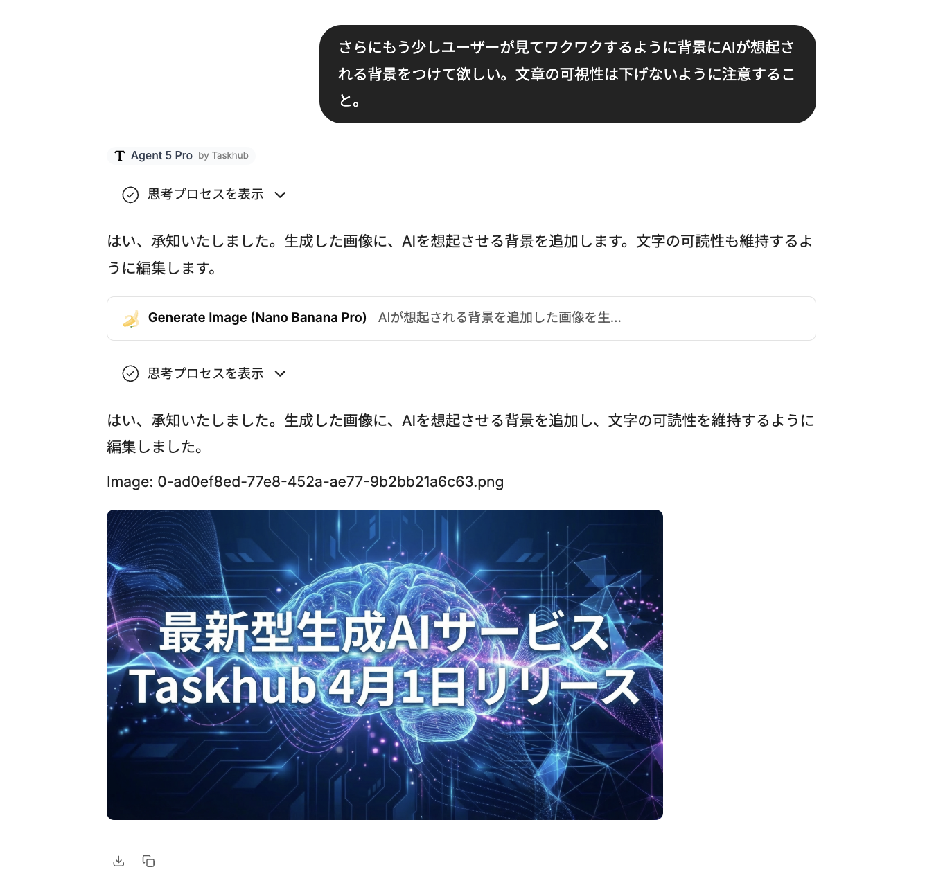 さらに「さらにもう少しユーザーが見てワクワクするように背景にAIが想起される背景をつけて欲しい。文章の可視性は下げないように注意すること。」というプロンプトを入力すると、文字やフォントが維持されたまま背景が追加された。追加プロンプトで画像の調整をすることにも対応している。ーTaskhub Agent 5 Proに搭載されたNano Banana Proを使用。