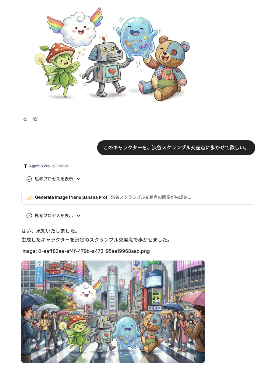 5匹の架空のキャラクターに対して、「このキャラクターを、渋谷スクランブル交差点に歩かせて欲しい。」というプロンプトを入れると、キャラクターはそのまんま、背景などを追加してくれた。逆に、渋谷スクランブル交差点にある日本語などは支離滅裂なものになった。やはりNano Banana Proは編集、高度な日本語力などを両立することはまだ難しいようだ。ーTaskhub Agent 5 Proに搭載されたNano Banana Proを使用。