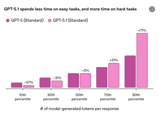 GPT-5.1は、性能向上と同時に、処理速度とコスト効率の改善も実現しています。特に「Instant」モードや、軽量モデルである「GPT-5.1-mini」は、GPT-5の同等モデルと比較して、応答速度(Time to First Token)が大幅に短縮されました。