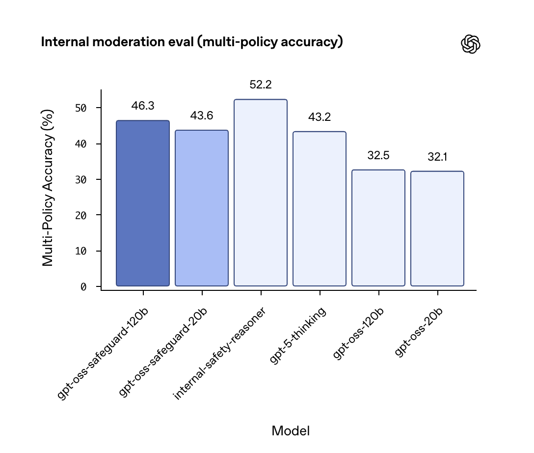 驚くべきことに、gpt-oss-safeguard(特に120Bモデル)は、OpenAIの最新かつ最強のクローズドモデルであるgpt-5-thinkingよりも高い精度で、ポリシーに基づく安全分類を達成しました。