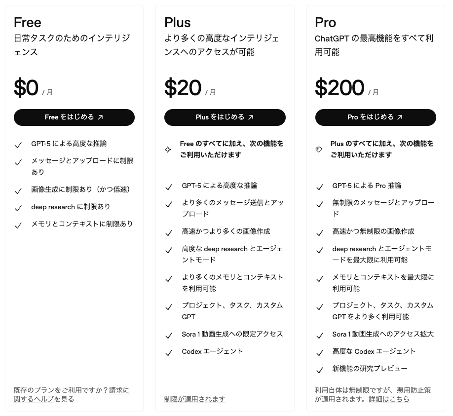 比較対象となるChatGPTの料金プラン体系については、公式サイトをご覧ください。https://chatgpt.com/ja-JP/pricing/
