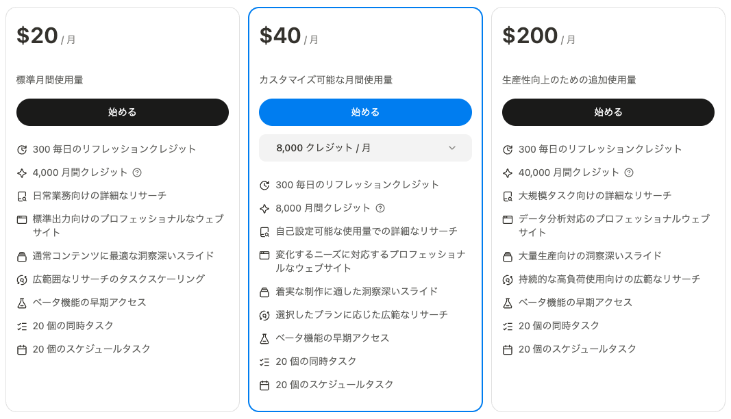 Manus 1.6には、利用頻度やタスクの重さに合わせた複数のプランが用意されています。