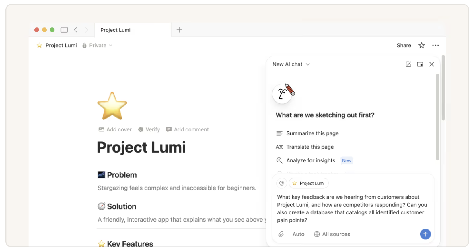 代表的な例が、ドキュメント作成ツール「Notion」に搭載された「Notion AI」です。Notionはもともとメモやデータベースを構築するツールとして人気を博していましたが、AIを活用することで検索性と情報整理能力が格段に向上しました。