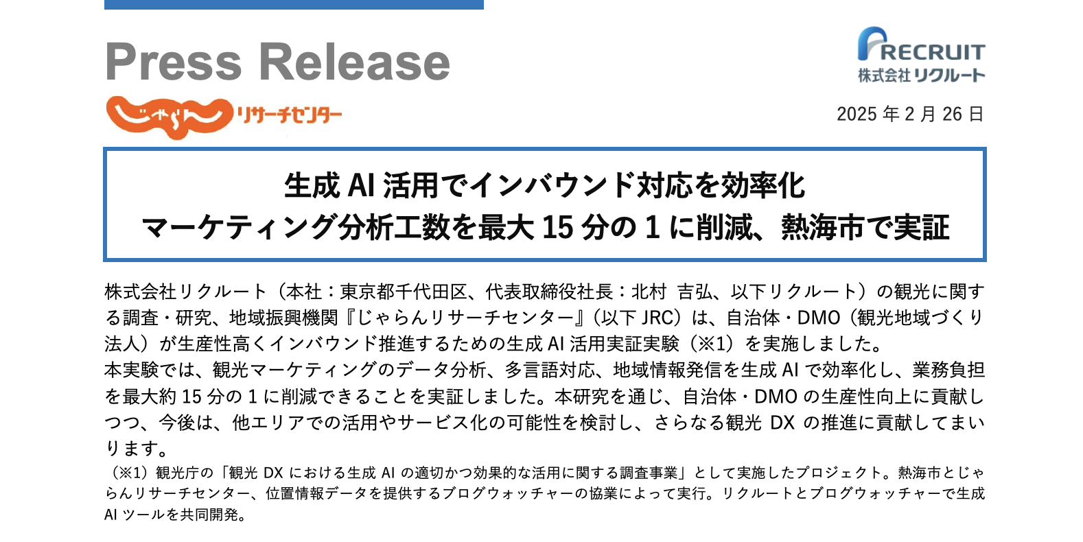 静岡県熱海市では、増加するインバウンド需要に伴い複雑化・増大する観光マーケティング業務を効率化するため、生成AIを活用した実証実験を行いました。