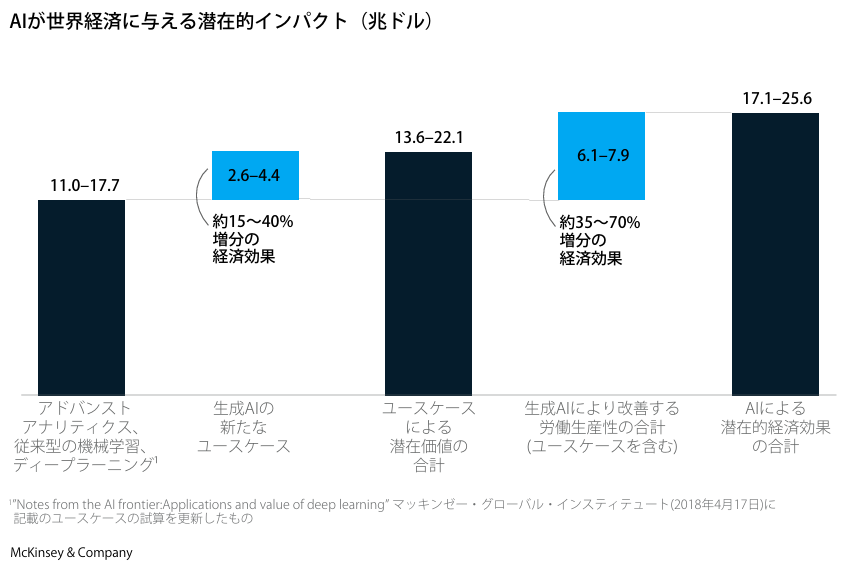 こちらは、マッキンゼーが生成AIがもたらす経済的インパクトと生産性向上への貢献について詳細に分析したレポートです。合わせてご覧ください。 https://www.mckinsey.com/jp/~/media/mckinsey/locations/asia/japan/our%20insights/the_economic_potential_of_generative_ai_the_next_productivity_frontier_colormama_4k.pdf