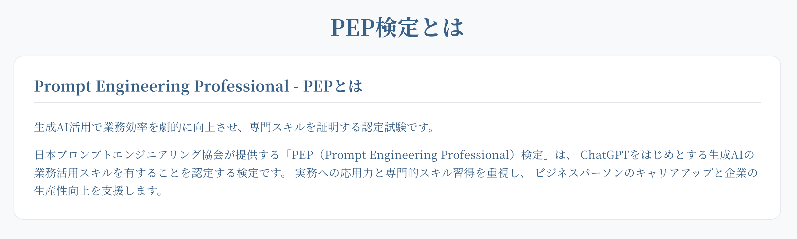 こちらは生成AIプロンプトエンジニア検定(PEP検定)の公式サイトです。合わせてご覧ください。 https://prompt.or.jp/pep