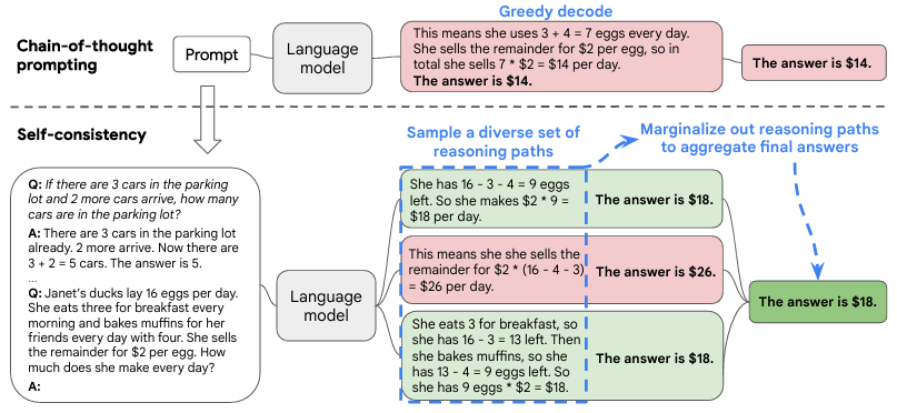 多様な思考経路をたどらせることで、単一の思考プロセスで発生しうる間違いを打ち消し、より信頼性の高い結論を導き出すことが可能です。