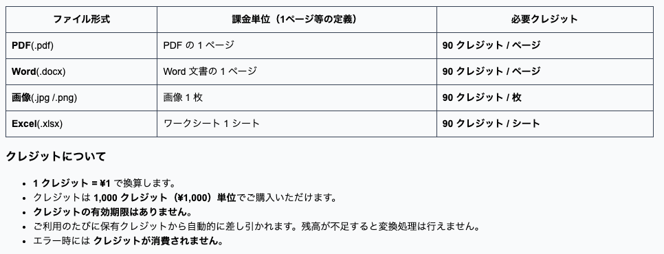 詳細なクレジット消費モデルや、ページ単価などの課金ロジックについては、公式サイトのプライシングページをご確認ください。 https://www.rag-ready-converter.com/manage?display=pricing