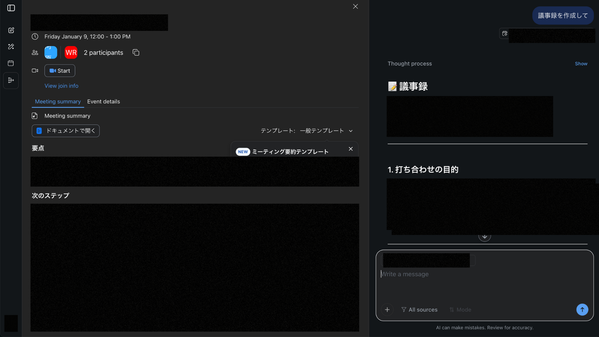 特に「ミーティングの要約」機能は非常に強力で、会議終了後に自動的に整理された要約がメールで届くため、議事録作成の手間を大幅に削減できます。