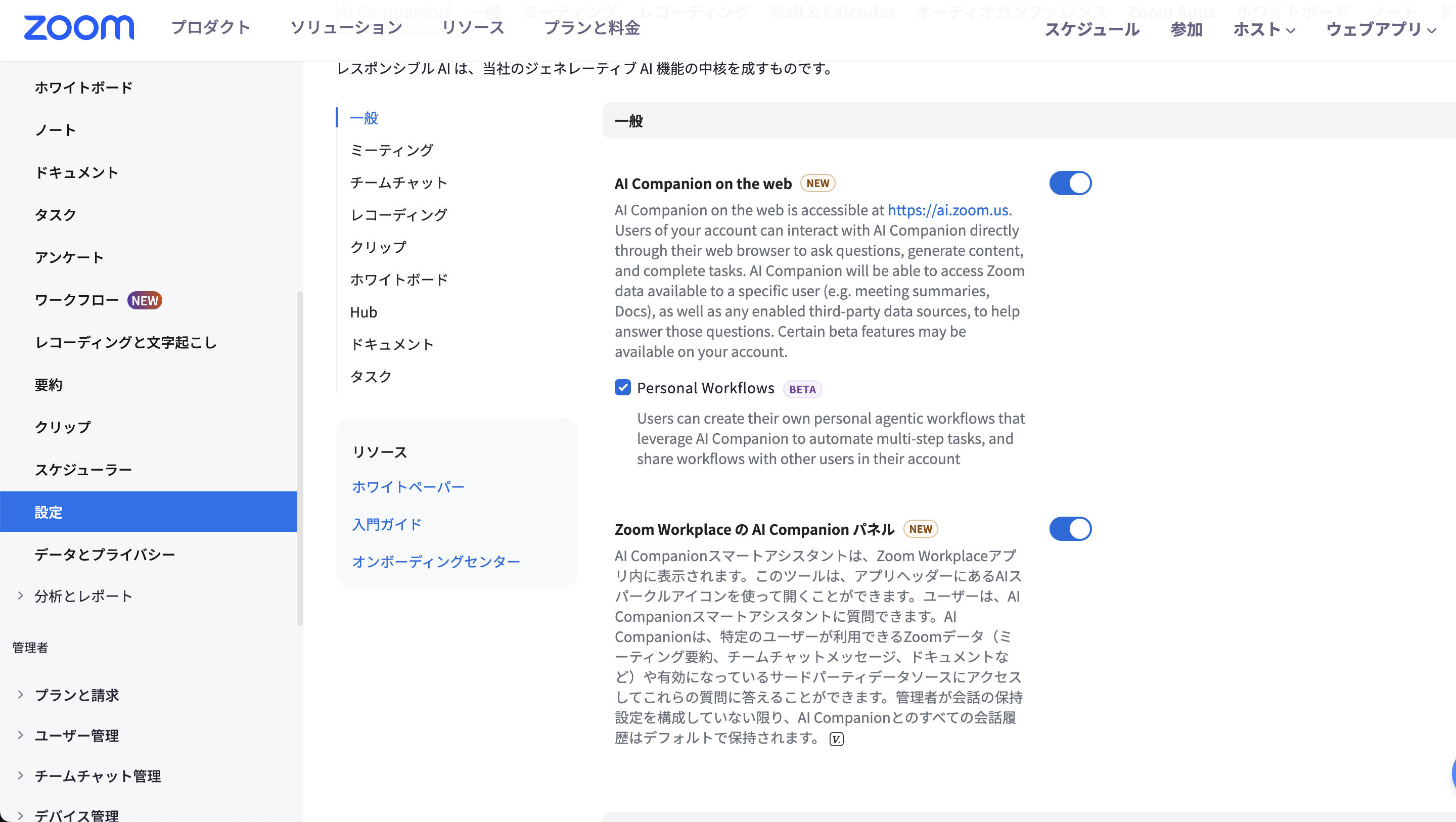 Zoomウェブポータルにログインし、「設定」メニュー内の「AI Companion」タブを開きます。 「ミーティングの要約」という項目を探し、スイッチをオンにして機能を有効化してください。