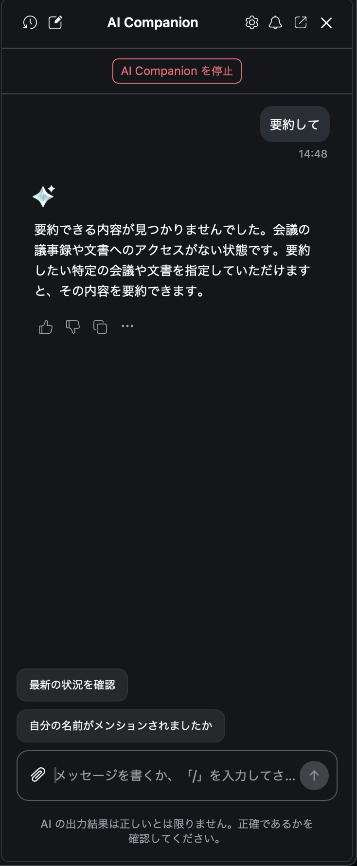 ※「AI Companion」をオンにすると、ミーティング中でも要約や議事録作成を依頼することが可能になる。