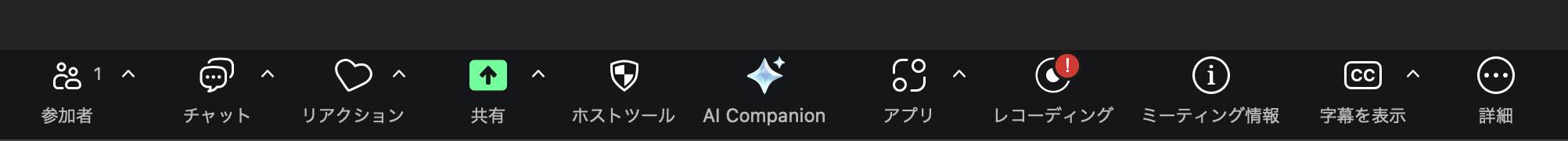 以下はZoomミーティング画面の下側になりますが、「レコーディング」をクリックすると出てくるボタンの中で、それぞれ