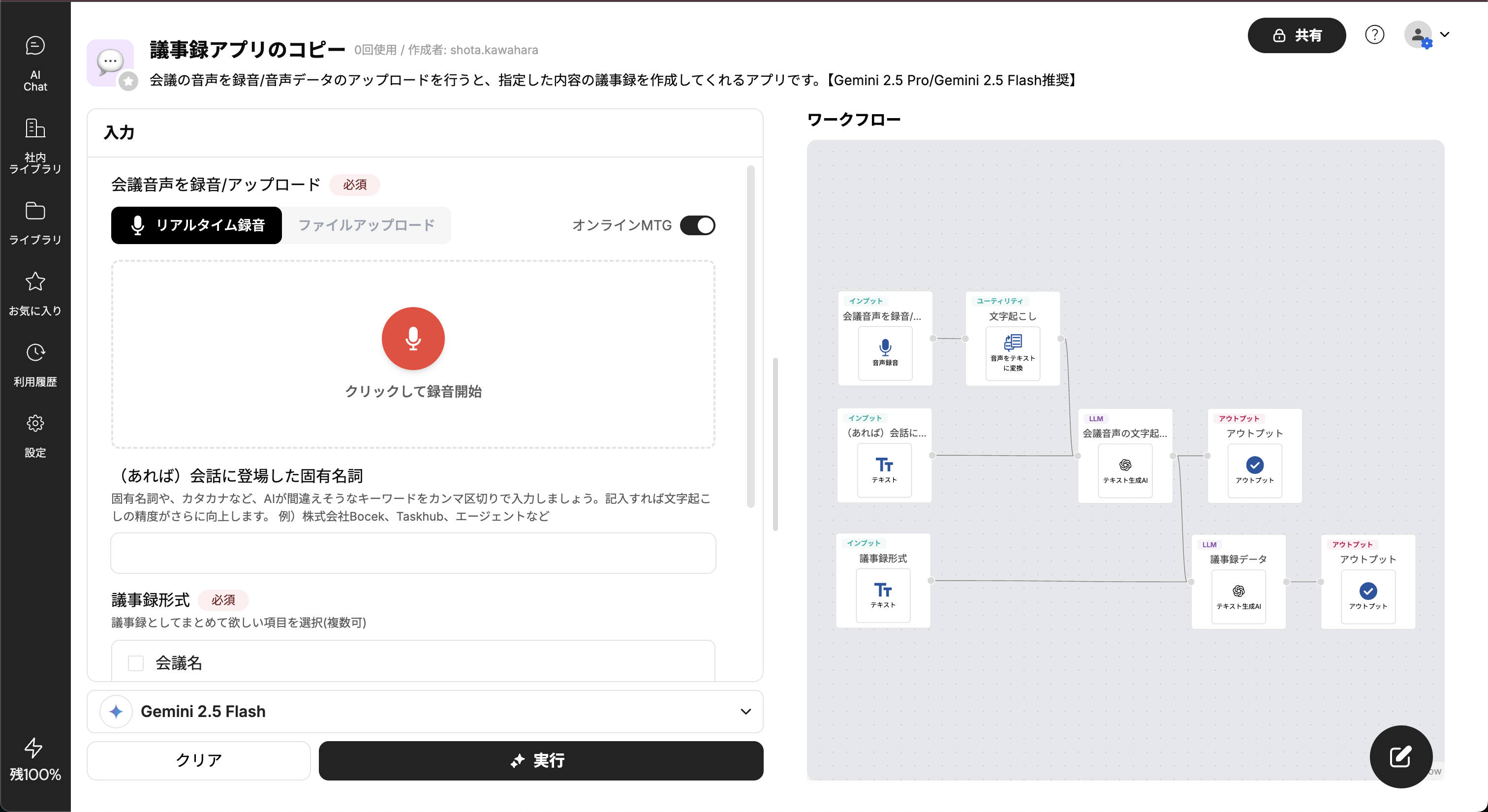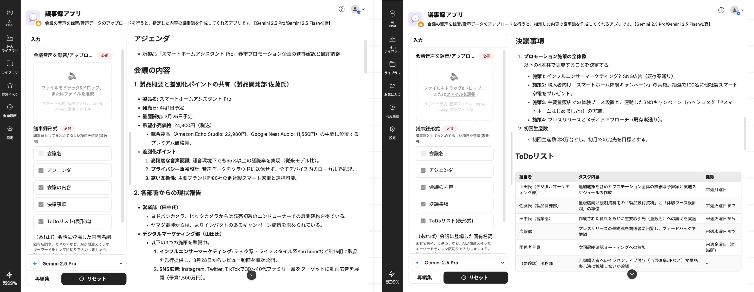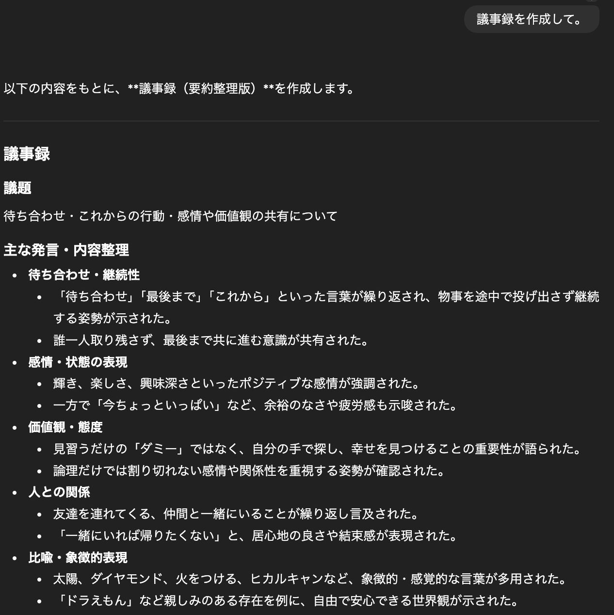 そのため、「ユーザー辞書機能」で専門用語を登録できるか、あるいは「プロンプト(指示)」を調整して、出力される議事録の形式(箇条書き、Q&A形式など)を変更できるかを確認してください。