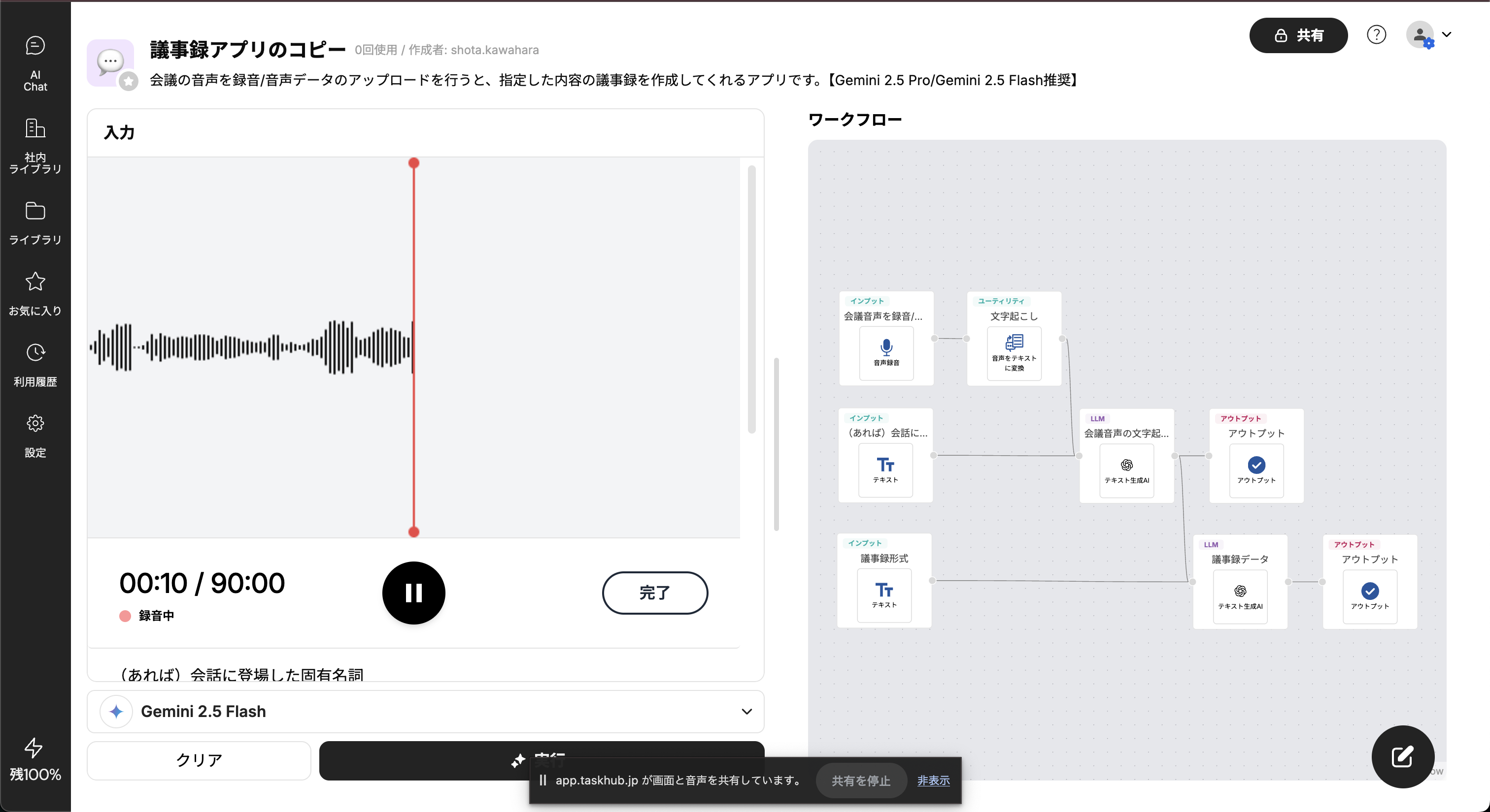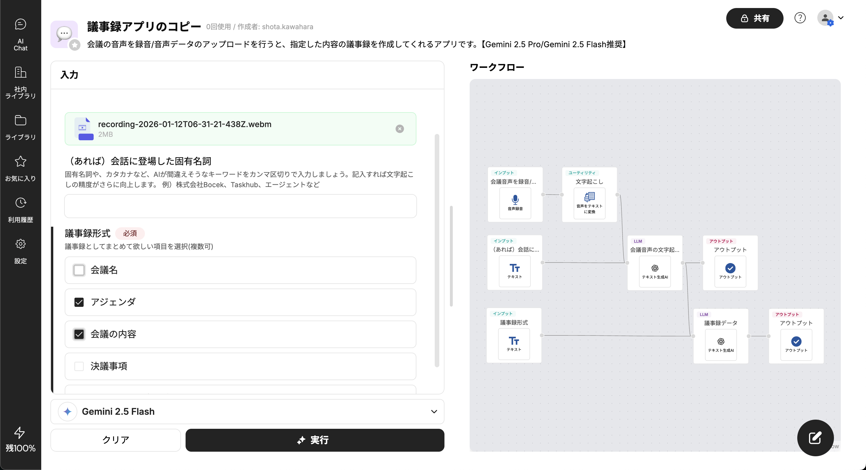 Taskhubは、議事録作成だけでなく、あらゆる業務を「アプリ」として選ぶだけで実行できる、日本初のアプリ型生成AIプラットフォームです。