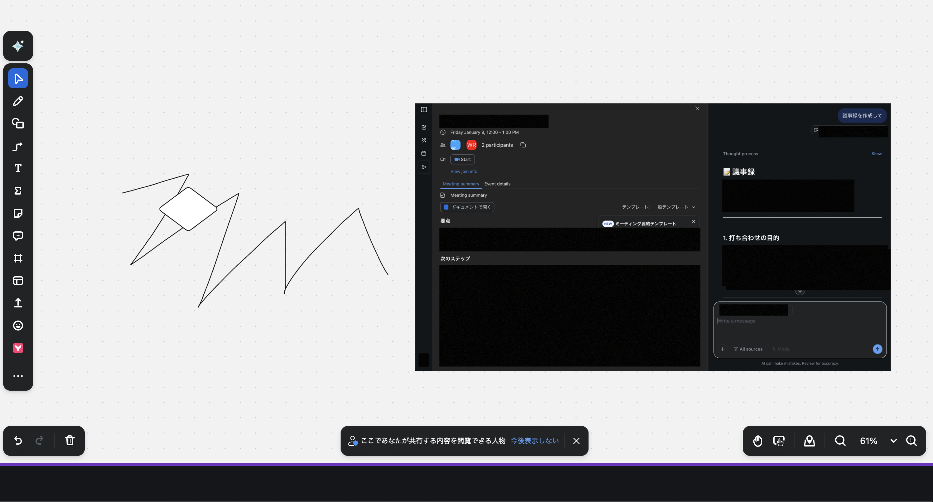 会議中に画面共有を行い、ホワイトボード機能や注釈機能を使って議論を可視化することも、質の高い議事録作成につながります。